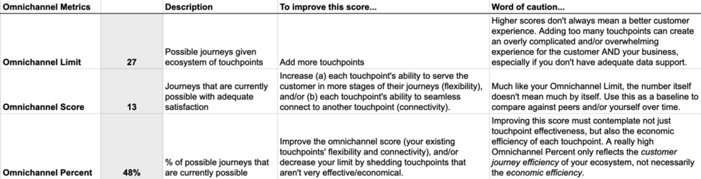 So what does omnichannel mean and how do you measure it? Omnichannel (a) means you have “flexible” and “connected” touchpoints, and (b) you can measure it by quantifying your (i) Omnichannel Limit, (ii) Omnichannel Score, and (iii) Omnichannel Percent.